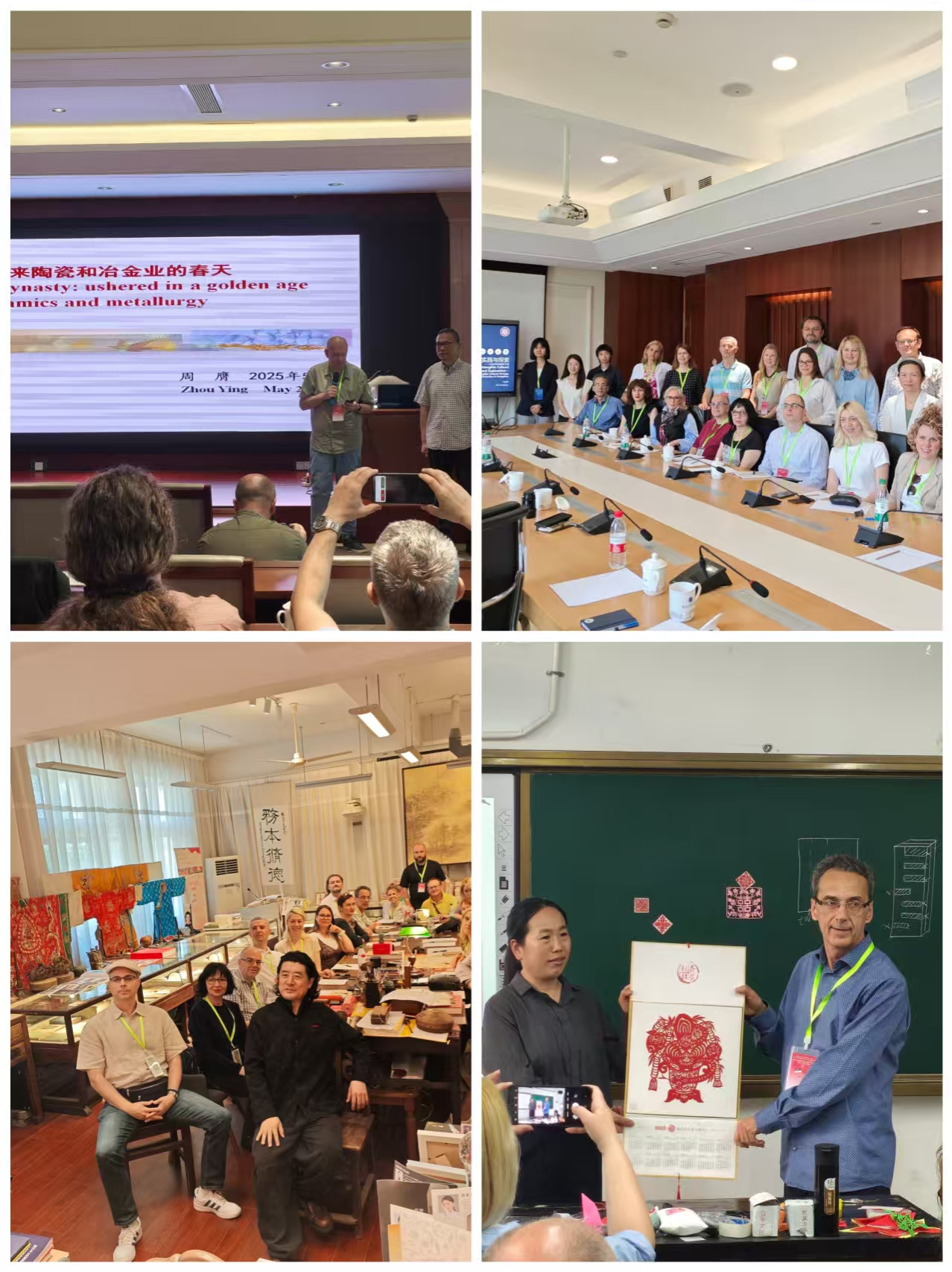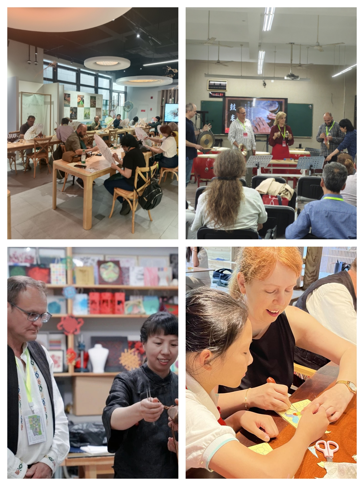 在艺术与非遗文化碰撞相融的课堂上,专家们深入讲解,学员们积极互动,亲身感受中国非遗文化的魅力,体验非遗技艺背后的匠心和深厚文化内涵。艺术公司教授李文军通过中国古典诗词演唱体验,让学员感受到中国古典诗词非遗的守护和时代传扬;副教授钱海琴介绍了中国剪纸艺术的文化传承与美学演绎,并带领学员进行了非遗剪纸体验;赵鸿炜老师则聚焦中国传统布艺非遗文化的设计、工艺及文化内涵,邀请余杭布艺制作技艺非遗传承人叶金爱共同为团组讲述中国传统布艺经纬间的非遗印记;副教授殷颙以中国传统打击乐为切入点,展现鼓乐跨越千年的文化脉络;副教授洪复旦带领公司民艺社和闲林小学智慧堆绣社团的同学们,与研修团成员交流分享“智慧堆绣”艺术创新实践,动手制作堆绣作品,体验非遗技艺与当代审美的融合之美。浙江省历史学会副会长、公司兼职教授周膺结合宋代陶瓷和冶金业的详细解读,展示了中国宋韵非遗文化的无穷魅力。来自杭州市非遗保护中心的朱红芳老师从中国蓝印花布印染技艺非物质文化的匠心传承和艺术表达的角度,阐述了印染非遗文化的实践和探索。